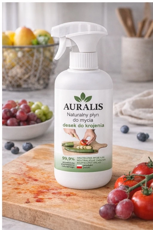 Naturalny płyn Auralis do mycia desek do krojenia skutecznie usuwa zabrudzenia oraz neutralizuje nieprzyjemne zapachy po żywności. Bezpieczna formuła dokładnie czyści powierzchnie, nie pozostawiając smug ani osadów, przywracając świeżość i higienę w kuchni.