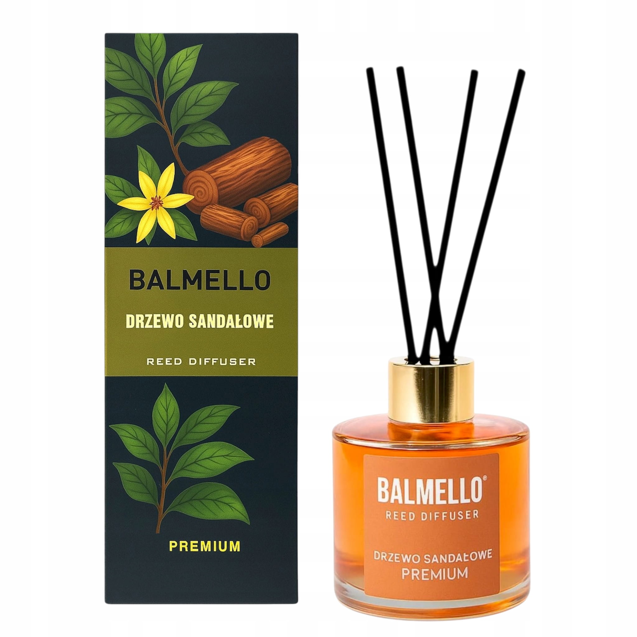 Balmello Drzewo sandałowe 120 ml to premium patyczki zapachowe o ciepłej, drzewnej kompozycji inspirowanej szlachetnym drewnem sandałowym. Elegancki flakon z patyczkami stopniowo uwalnia zapach, nadając wnętrzom przytulny, relaksujący klimat – idealny do salonu, sypialni, gabinetu, łazienki i domowego SPA.