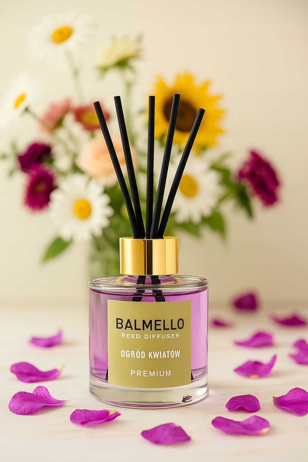Perfumowana esencja zamknięta w szklanym flakonie stopniowo wsiąka w patyczki, które dzień po dniu uwalniają aromat do otoczenia. Dzięki temu w domu, mieszkaniu lub biurze utrzymuje się stały, przyjemnie kwiatowy zapach, bez konieczności korzystania ze świec, prądu czy aerozoli. Marka Balmello to segment premium, dlatego kompozycje są dopracowane, trwałe i wizualnie spójne z eleganckim wystrojem.