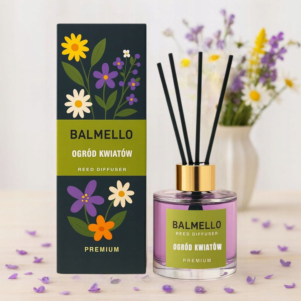 Balmello Ogród kwiatów 120 ml to premium patyczki zapachowe o eleganckiej, bukietowej kompozycji, która przywodzi na myśl świeży ogród pełen kwiatów. Dekoracyjny flakon z patyczkami stopniowo uwalnia aromat, nadając wnętrzom przytulny, kwiatowy i wyraźnie „perfumeryjny” klimat. Idealne do salonu, sypialni, korytarza, łazienki, gabinetu i biura.