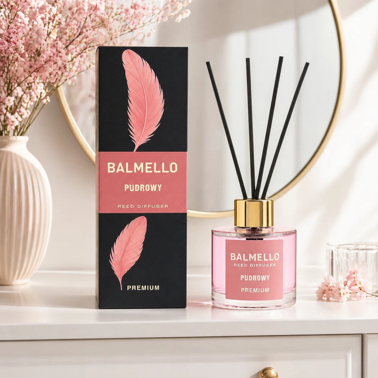 Balmello Pudrowy 120 ml to premium patyczki zapachowe o delikatnym, czystym i pudrowym aromacie. Elegancki flakon z patyczkami stopniowo uwalnia zapach, nadając wnętrzom spokojny, przytulny i świeży klimat. Idealne do sypialni, pokoju dziecka, salonu, korytarza, łazienki oraz gabinetu.