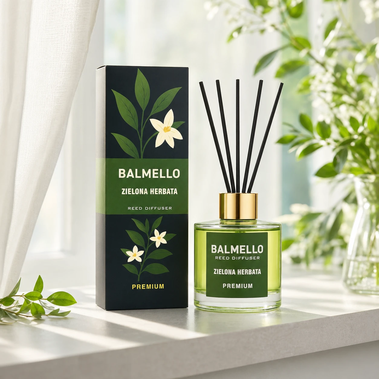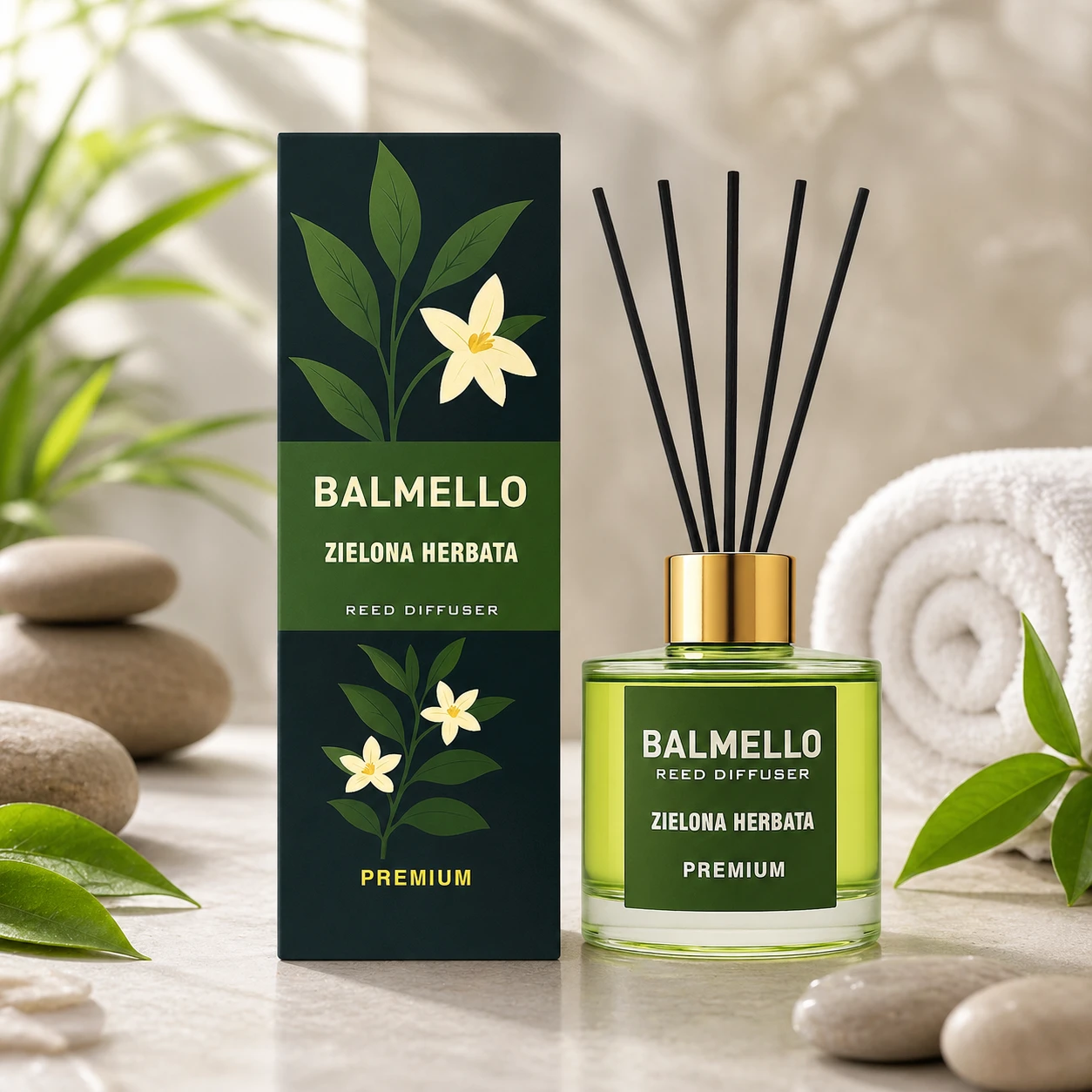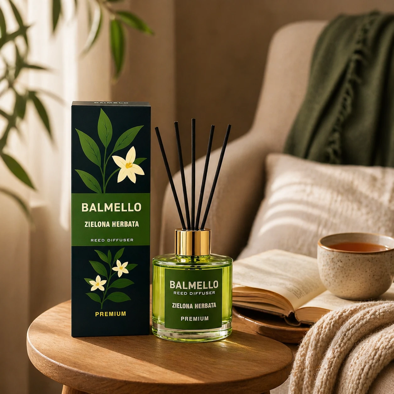 Balmello Zielona herbata 120 ml to premium patyczki zapachowe o świeżej, delikatnie ziołowej kompozycji inspirowanej aromatem zielonej herbaty. Zapach jest lekki, uspokajający i bardzo „czysty” – idealny do wnętrz, w których chcesz podkreślić wrażenie świeżości, harmonii i porządku.