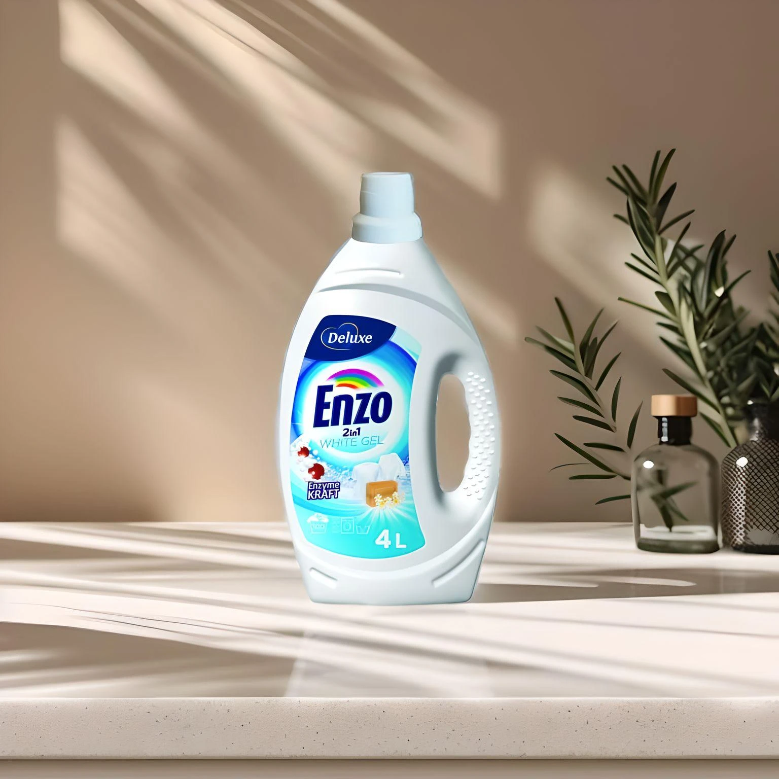 Deluxe Enzo White to pewność, że białe tkaniny pozostaną jasne, czyste i zadbane nawet po wielu praniach. Wysoka skuteczność i wyjątkowa wydajność sprawiają, że jest to idealny wybór do codziennego użytku.