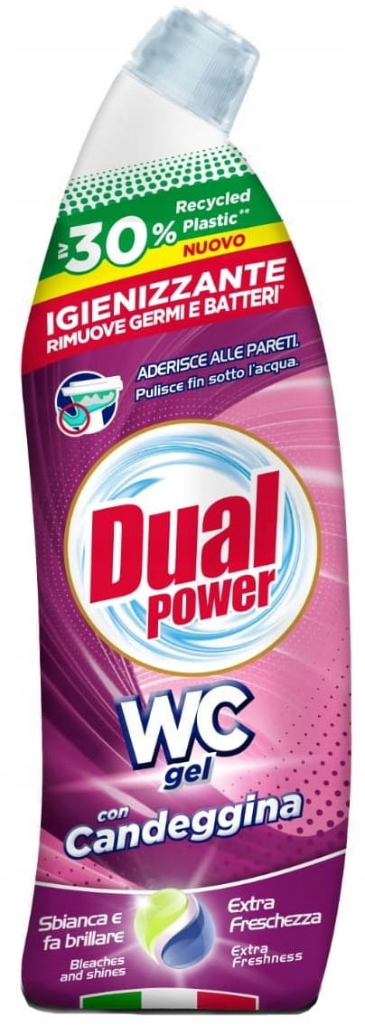 Dual Power Candeggina to niezawodny żel do toalety, który skutecznie usuwa zabrudzenia, osady i nieprzyjemne zapachy, zapewniając higieniczną czystość. Dzięki formule wzbogaconej o działanie wybielające, żel nie tylko czyści, ale także przywraca białą barwę powierzchni, usuwając przebarwienia i zapobiegając ich ponownemu pojawianiu się. Jego mocno skoncentrowana formuła radzi sobie z trudnymi zabrudzeniami, pozostawiając po sobie przyjemny zapach świeżości.