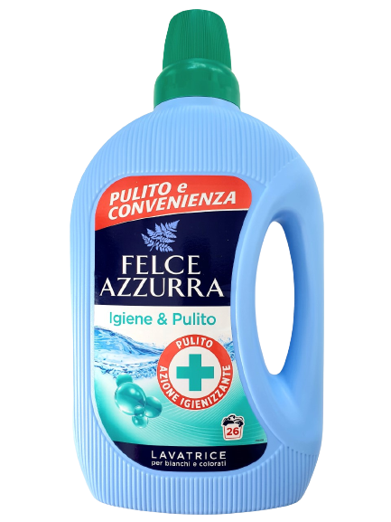 Felce Azzurra Płyn do prania Igiene & Pulito 1,56 l to detergent w płynie do codziennego prania. Zapewnia czysty efekt, dobrze rozpuszcza się w wodzie i pozostawia świeży zapach na tkaninach. Do pralki i prania ręcznego.