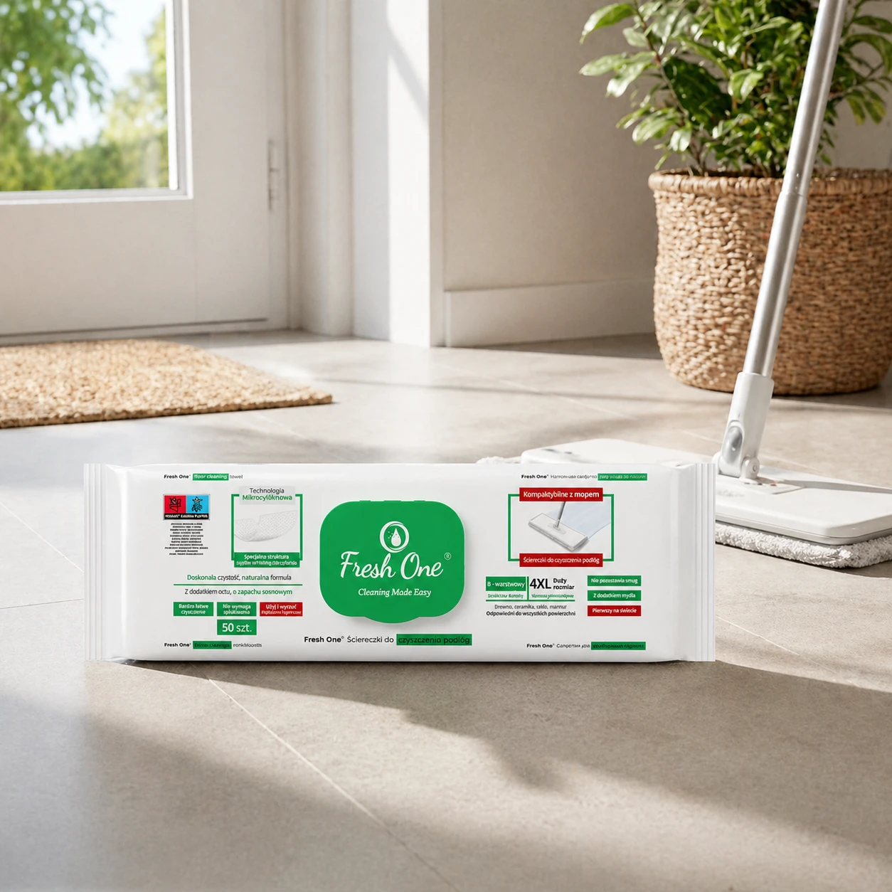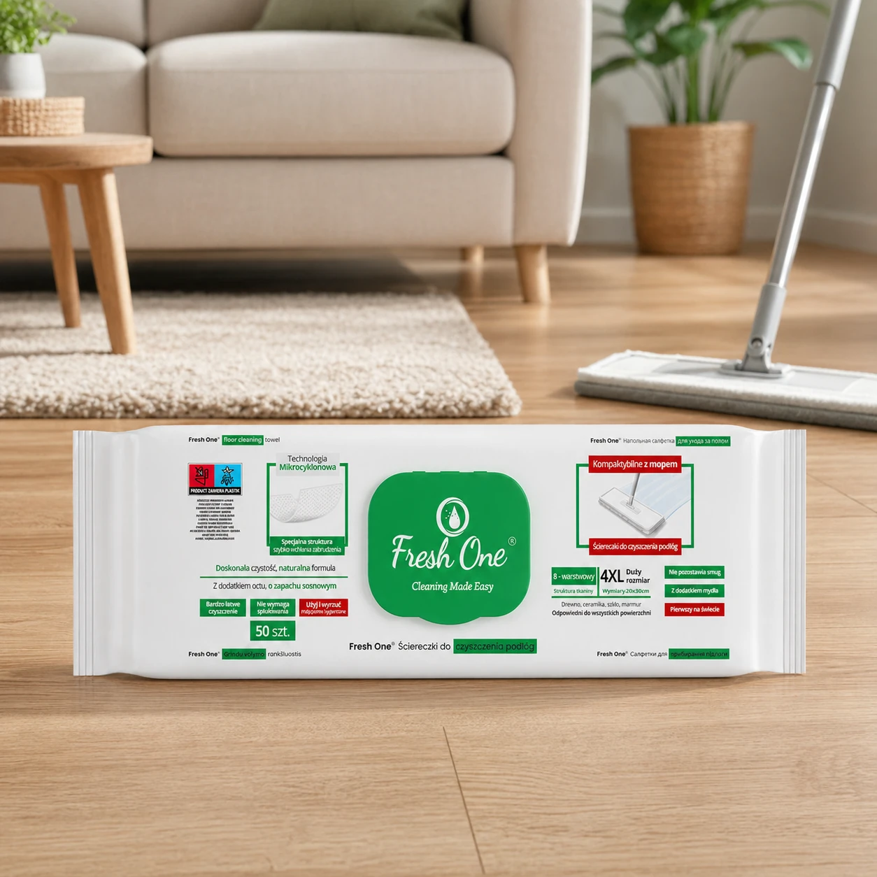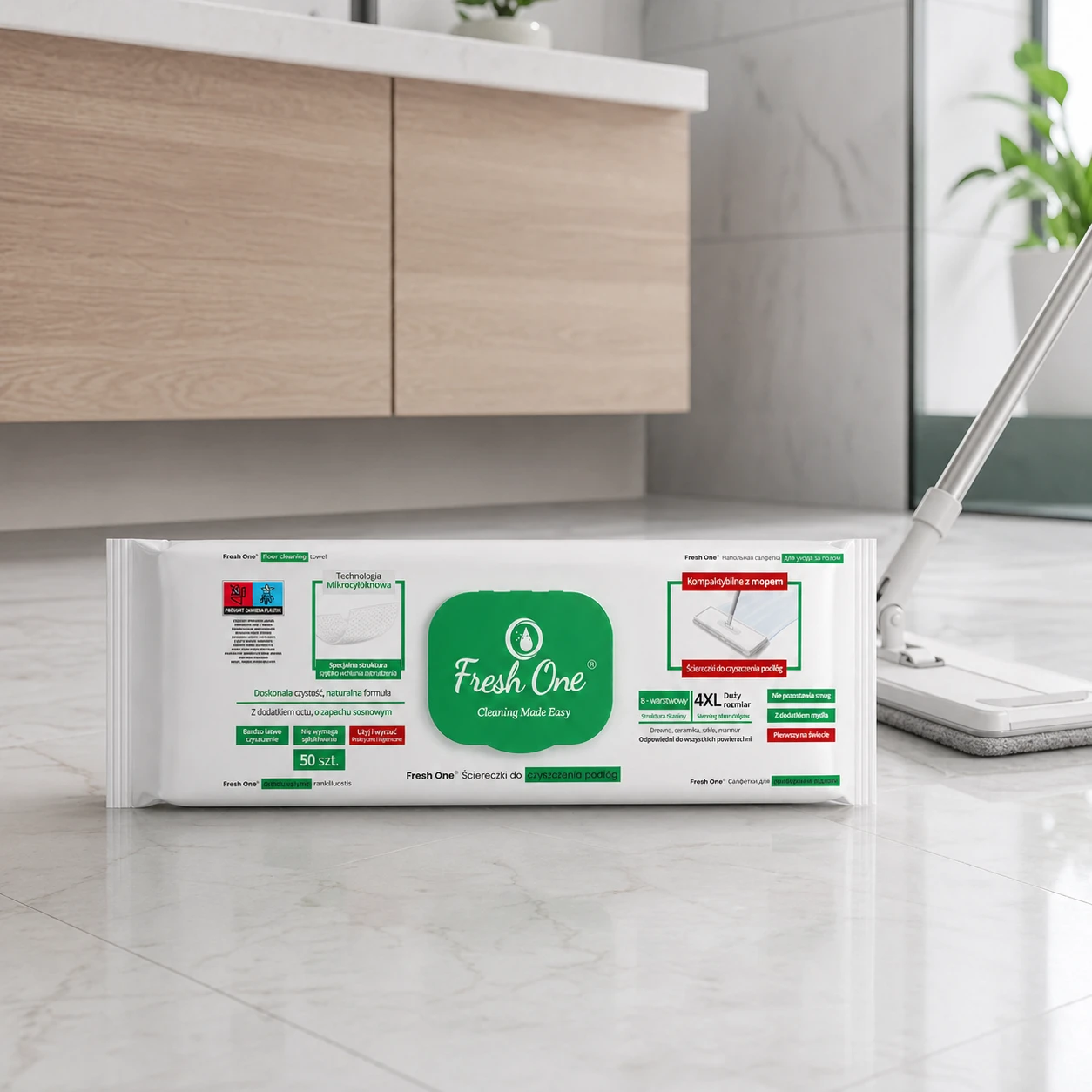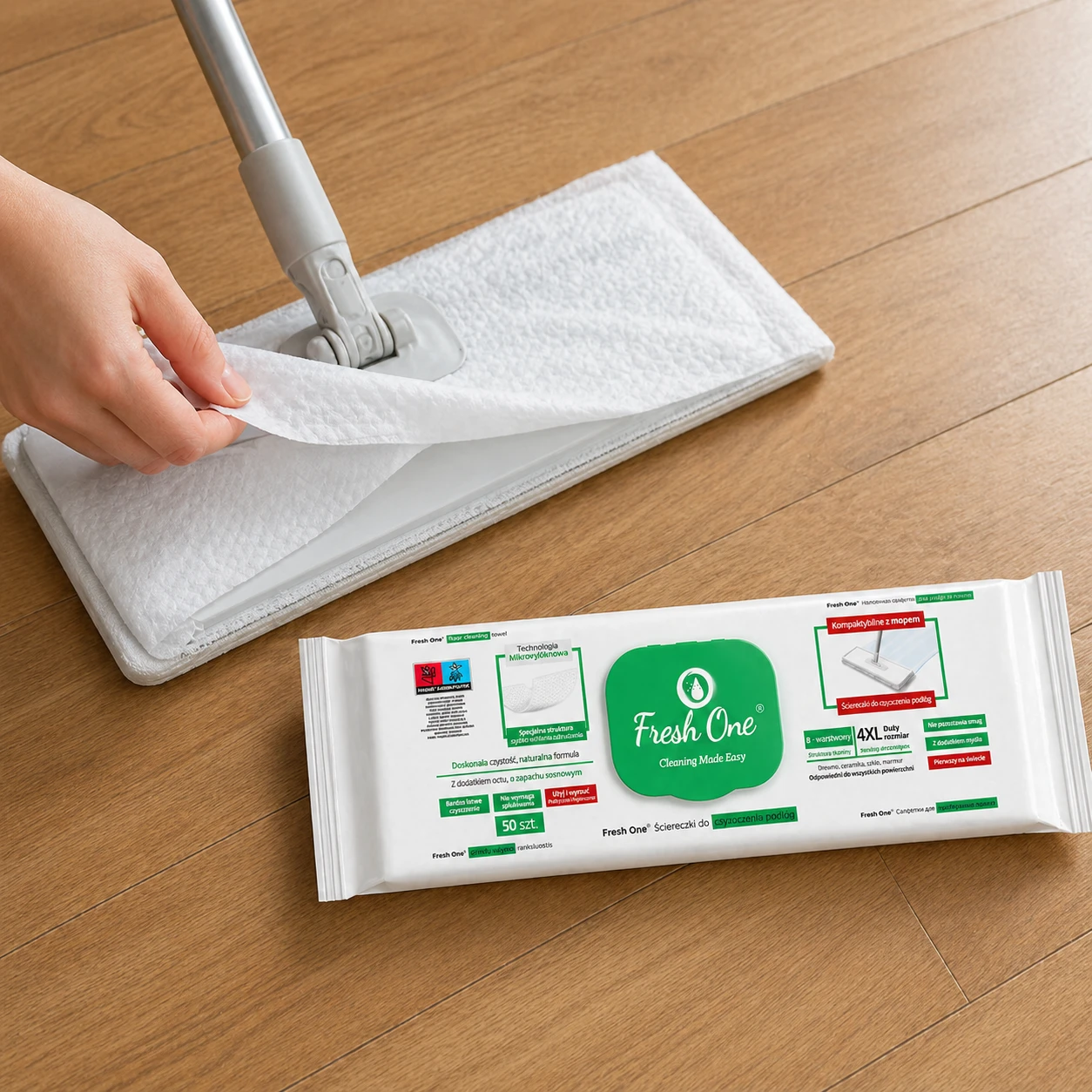 Fresh One MOP Sosna 50 szt. 4XL – nawilżane chusteczki do podłóg XXL, z zapachem sosny, antystatyczne, bez smug.