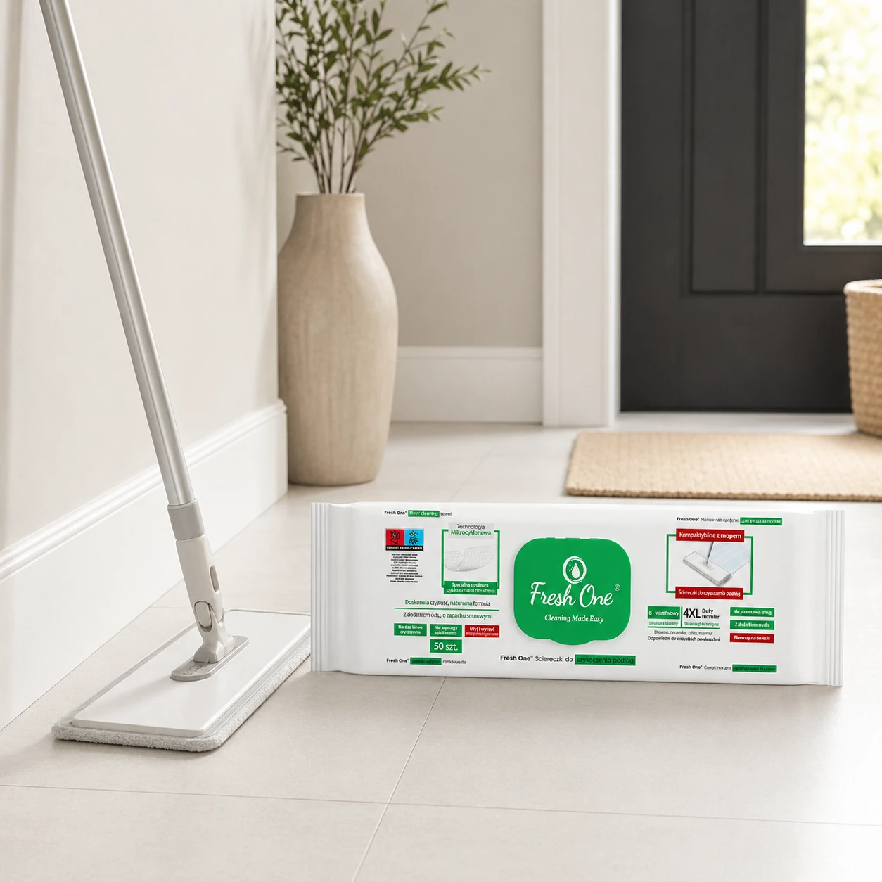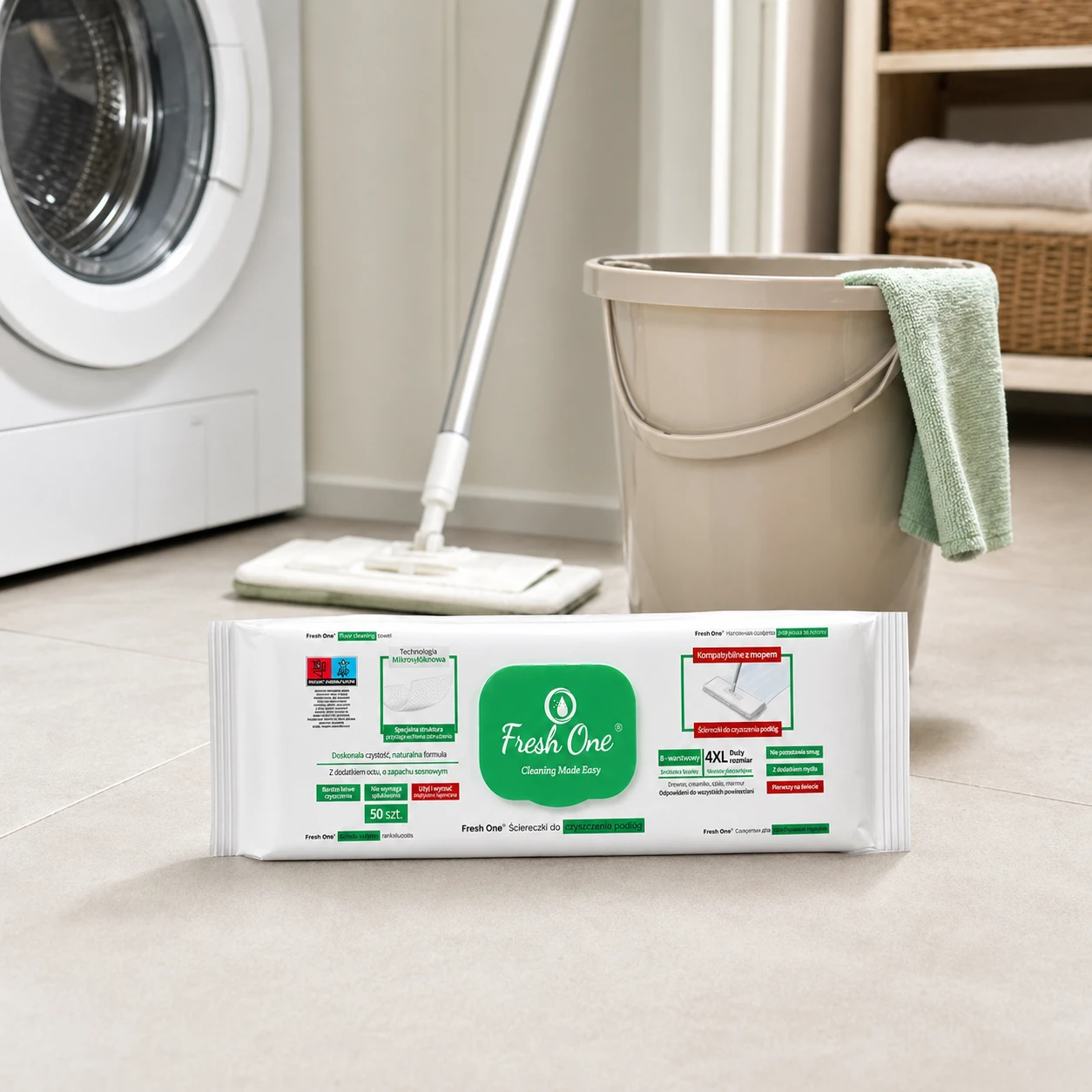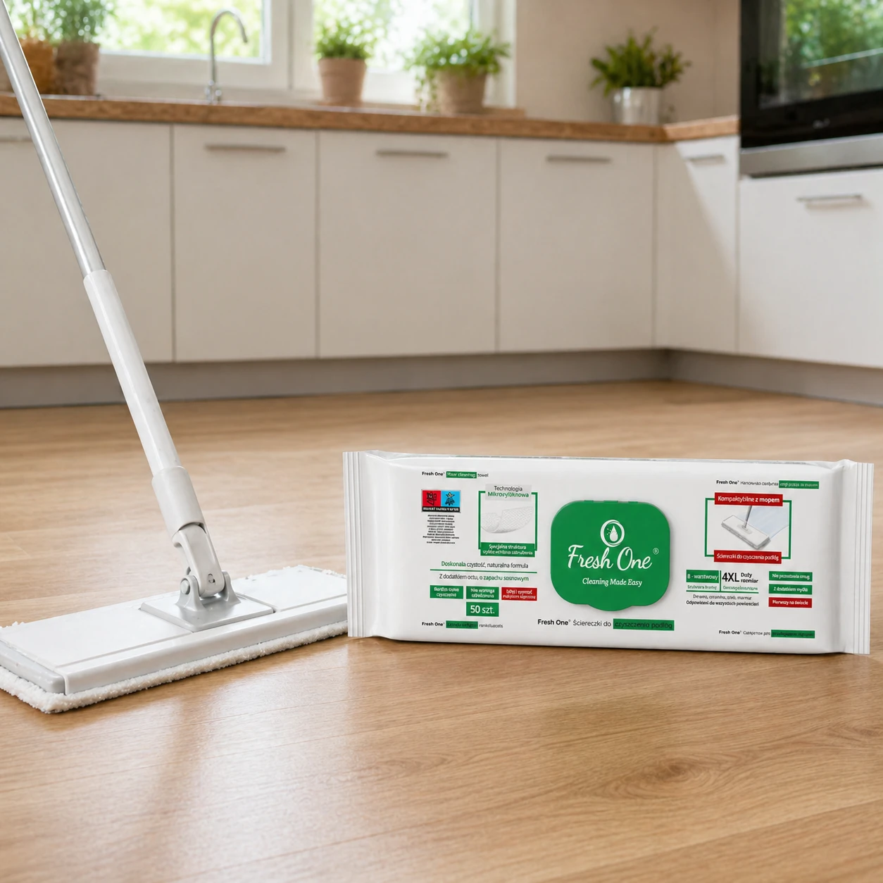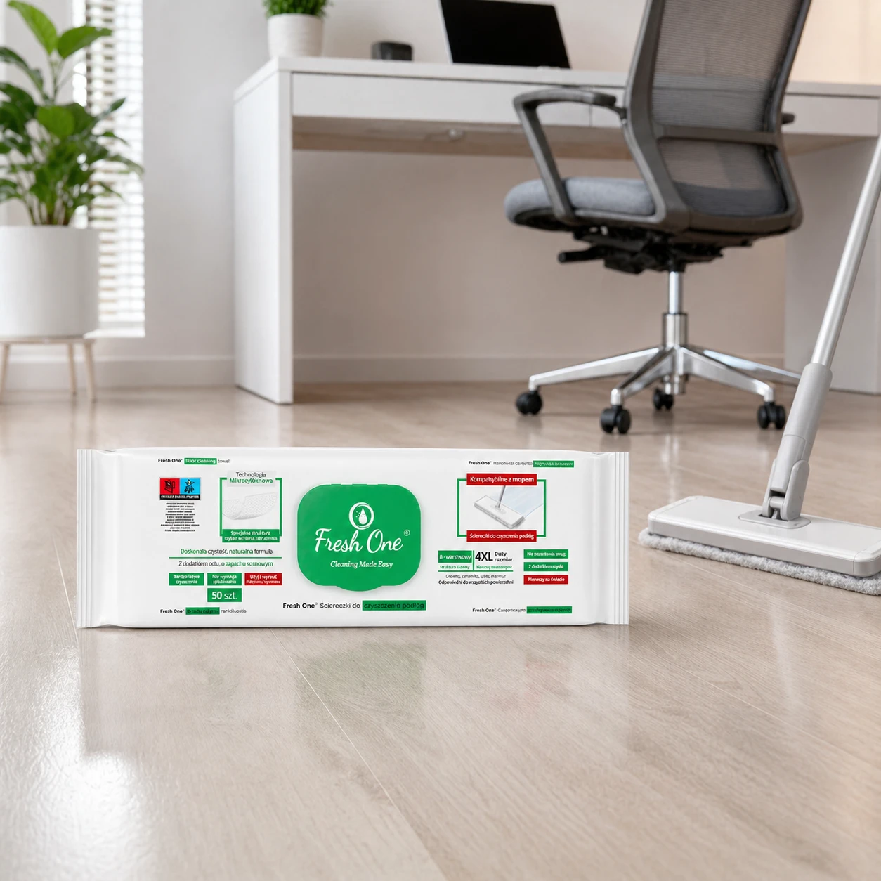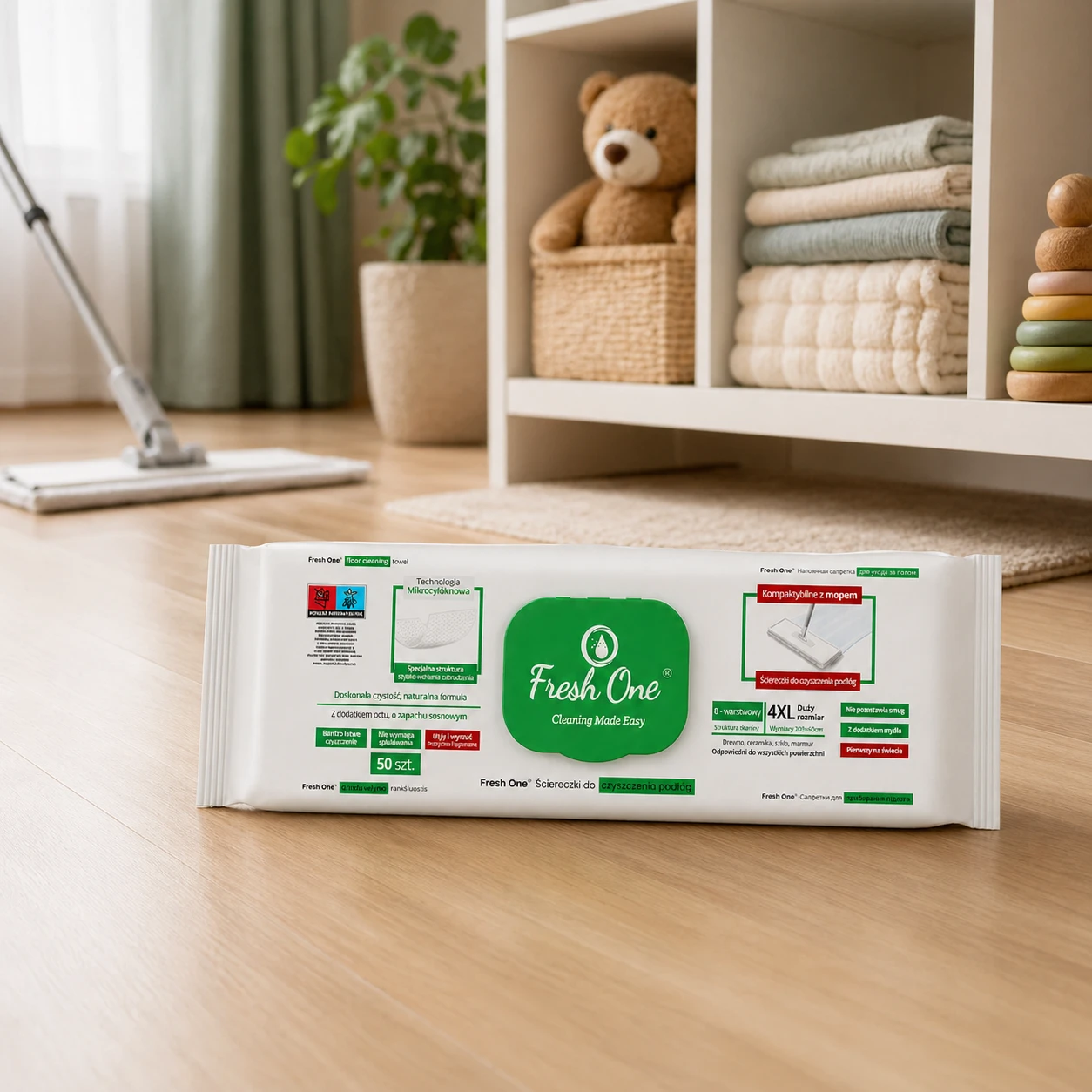Fresh One MOP Sosna 50 szt. 4XL – nawilżane chusteczki do podłóg XXL, z zapachem sosny, antystatyczne, bez smug.
