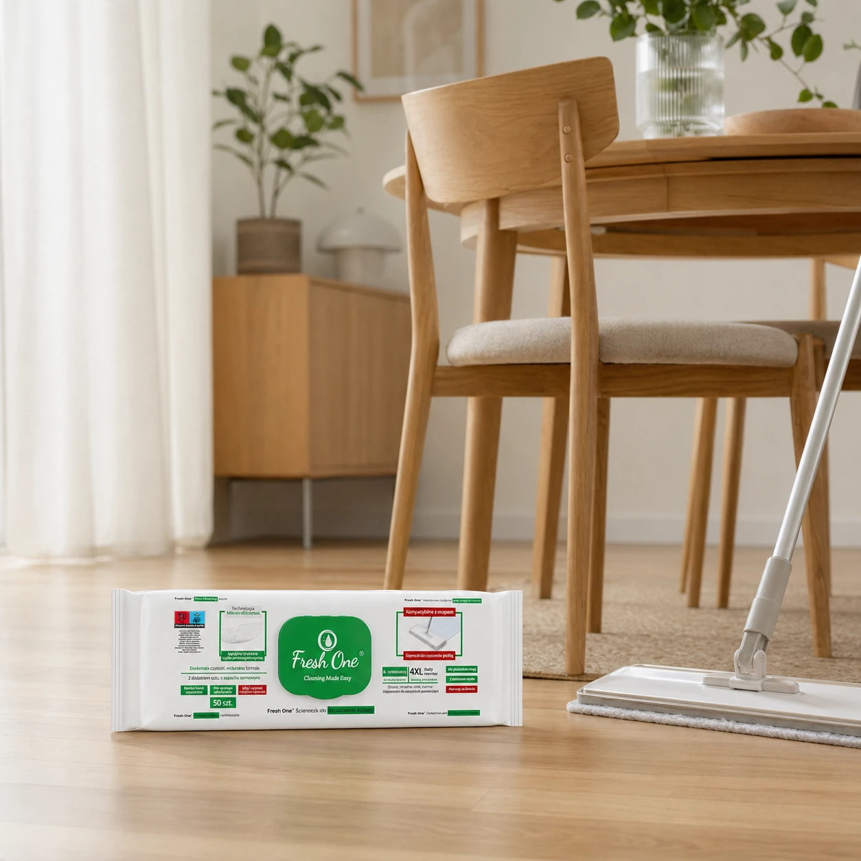 Fresh One MOP Sosna 4XL to wyjątkowo duże, nawilżane chusteczki do podłóg (rozmiar XXL), idealne do szybkiego i wygodnego sprzątania dużych powierzchni. Każda z 50 chusteczek nasączona jest skoncentrowanym płynem o świeżym aromacie sosny, który skutecznie usuwa kurz, plamy i tłuste zabrudzenia, jednocześnie działając antystatycznie i pozostawiając podłogę bez smug. Dzięki dużemu rozmiarowi 4XL pokryją więcej powierzchni za jednym przetarciem, upraszczając i przyspieszając codzienny porządek.