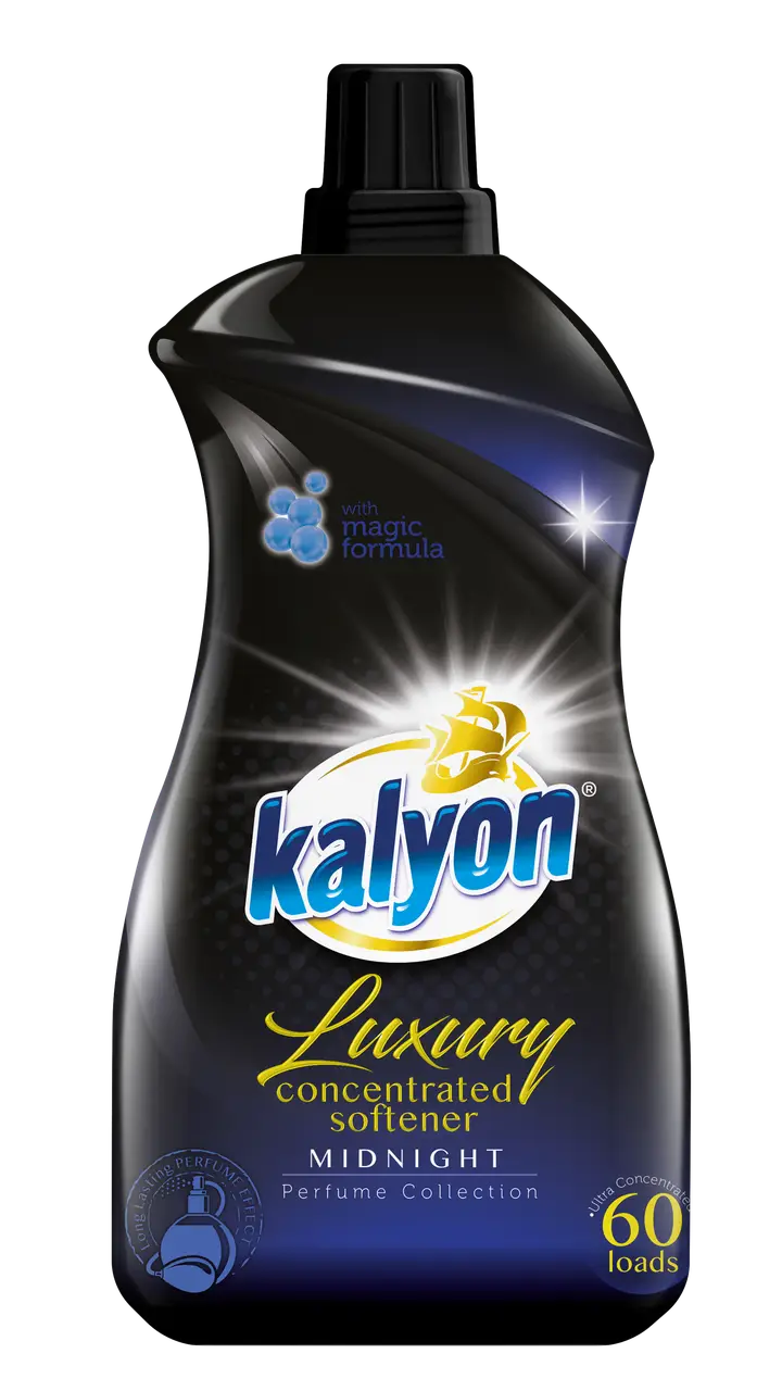 Kalyon koncentrat do płukania tkanin 1,5L (do 60 płukań) Midnight. Nadaje ubraniom miękkość i przyjemny, perfumowany zapach, pozostawiając świeżość na dłużej. Wydajna formuła do codziennego prania.