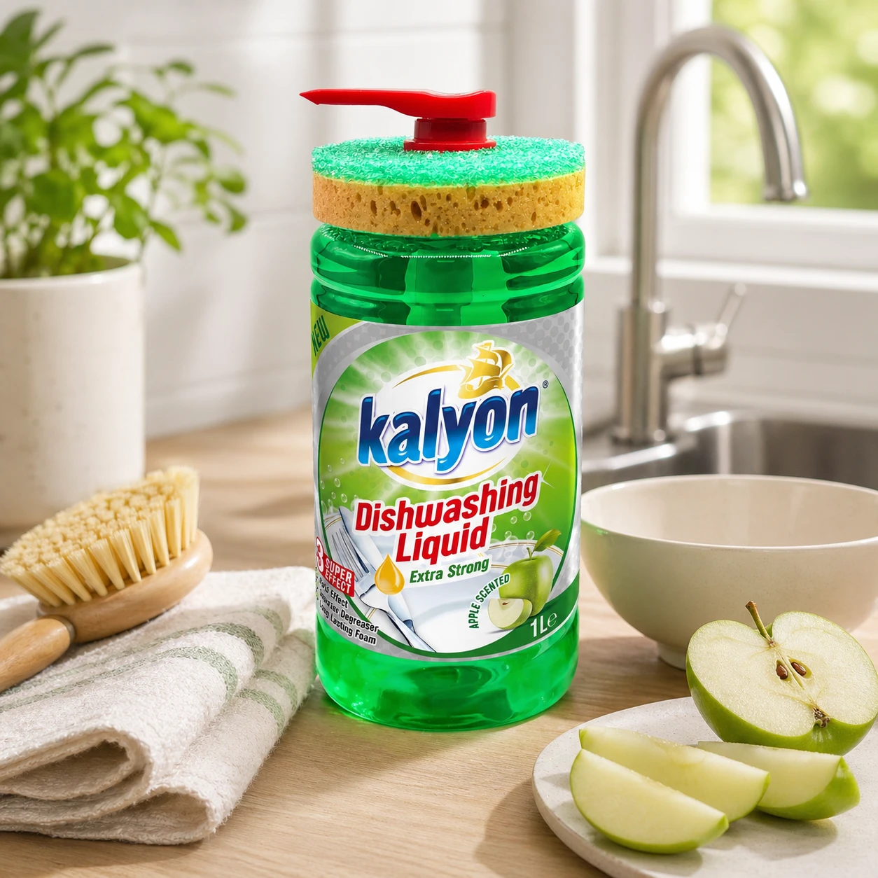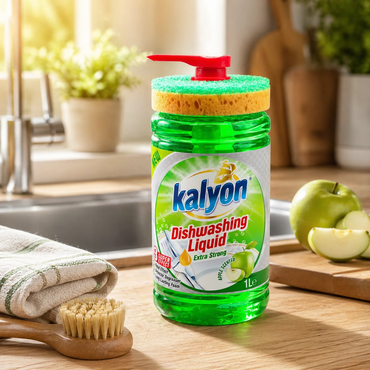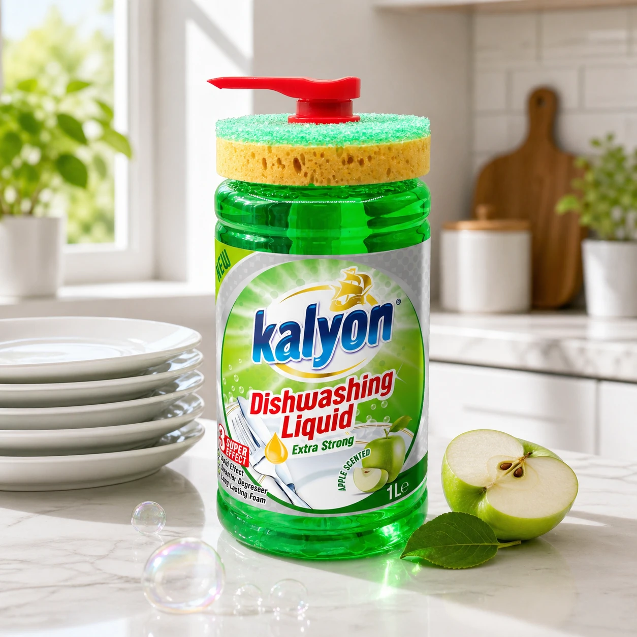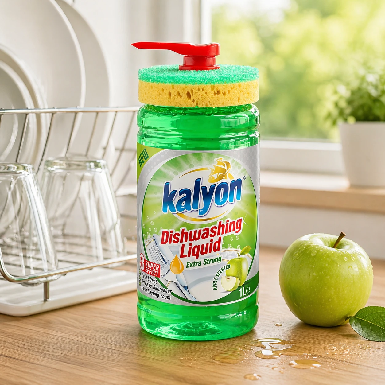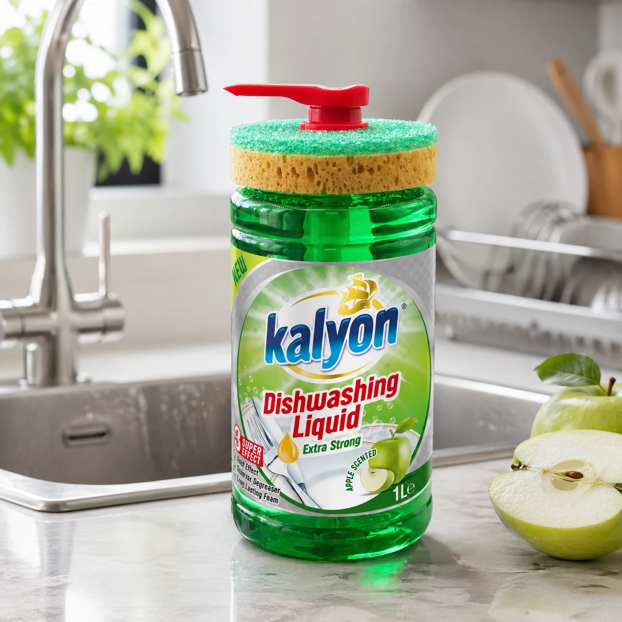 Kalyon Płyn do naczyń z dozownikiem 1 l (Apple Scented) to praktyczne rozwiązanie do kuchni, które łączy skuteczny płyn do mycia naczyń z wygodą użytkowania. Unikalna butelka z pompą dozującą ułatwia precyzyjne odmierzenie płynu bez chlapania i marnowania produktu, a dołączona gąbka jest zaprojektowana tak, aby wygodnie spoczywała na butelce – wszystko masz pod ręką.