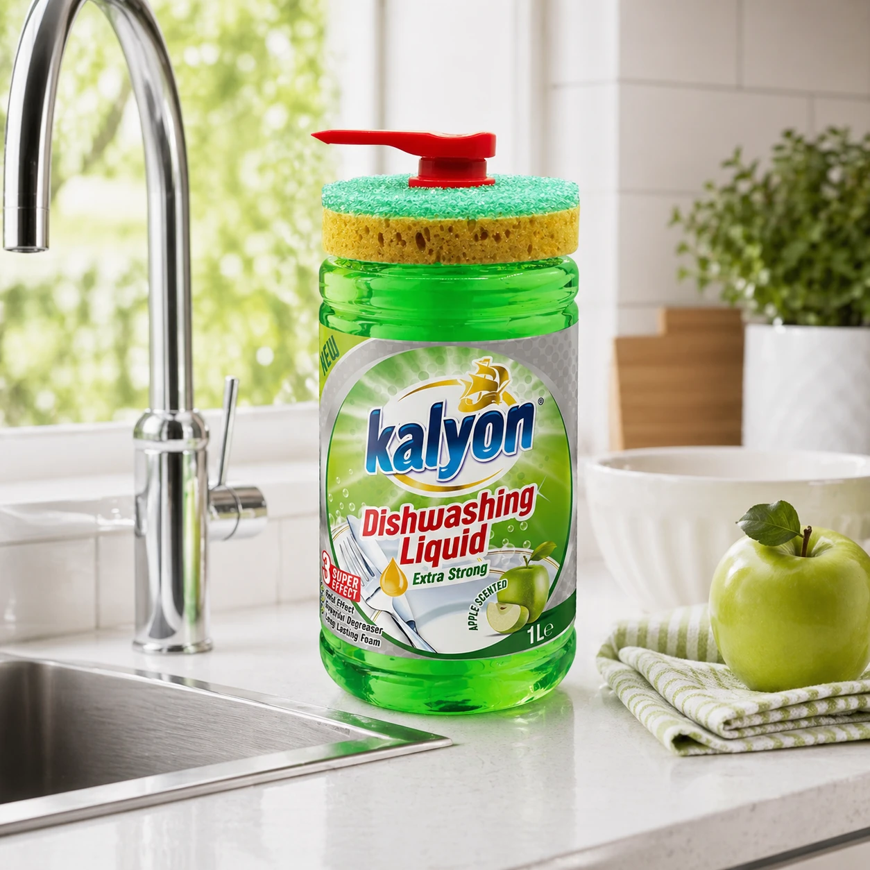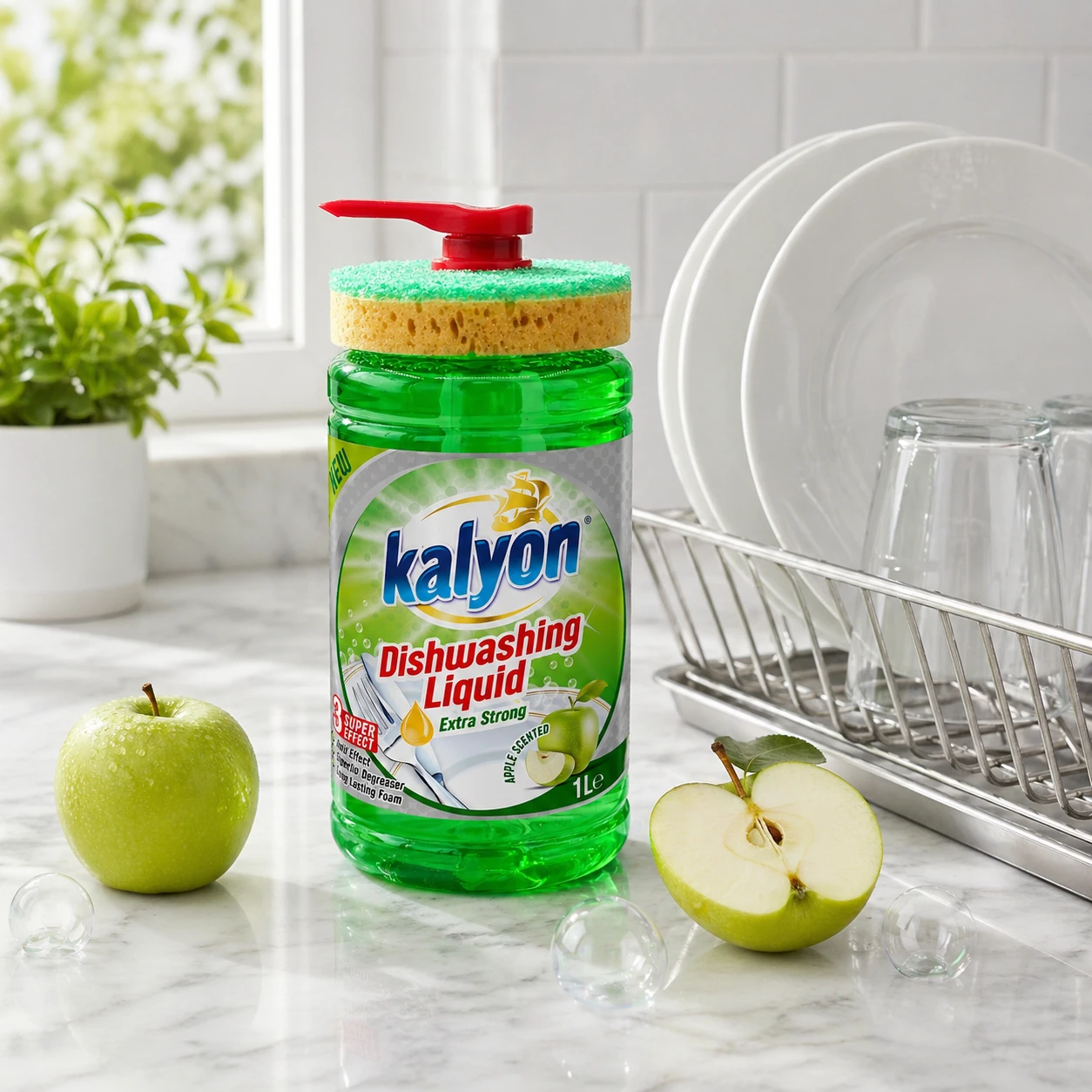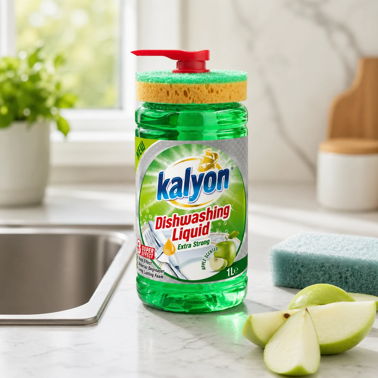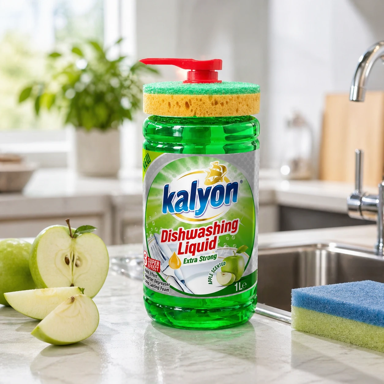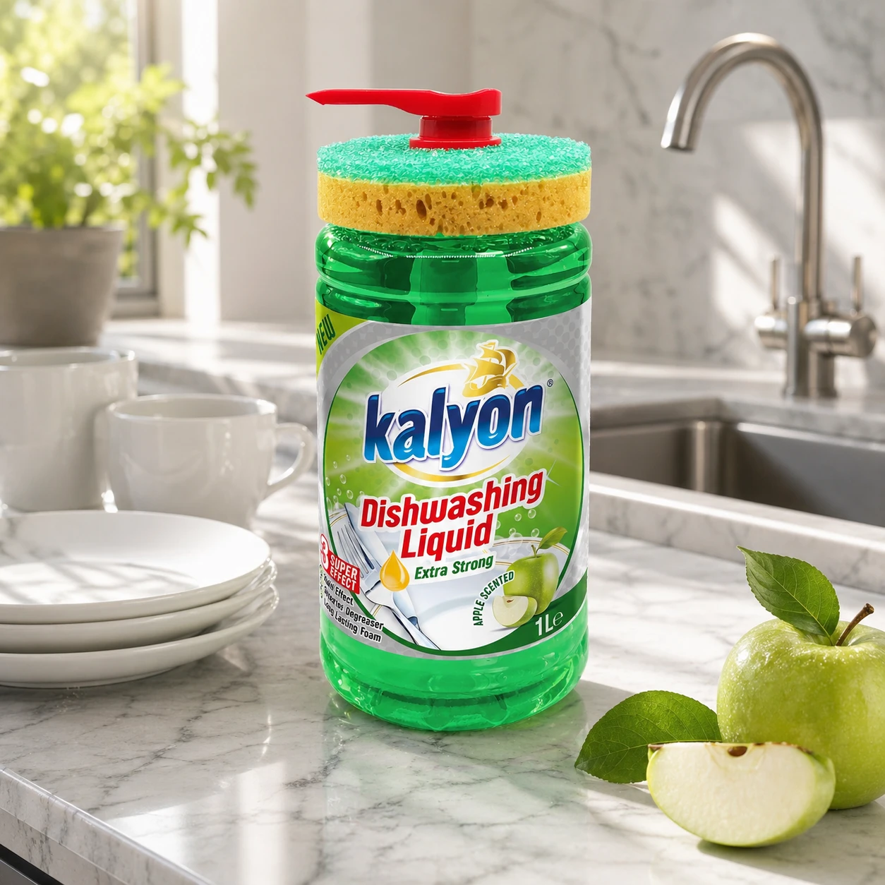 Kalyon Płyn do naczyń z dozownikiem 1 l (Apple Scented) to praktyczne rozwiązanie do kuchni, które łączy skuteczny płyn do mycia naczyń z wygodą użytkowania. Unikalna butelka z pompą dozującą ułatwia precyzyjne odmierzenie płynu bez chlapania i marnowania produktu, a dołączona gąbka jest zaprojektowana tak, aby wygodnie spoczywała na butelce – wszystko masz pod ręką.
