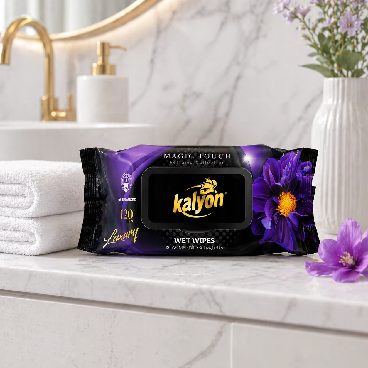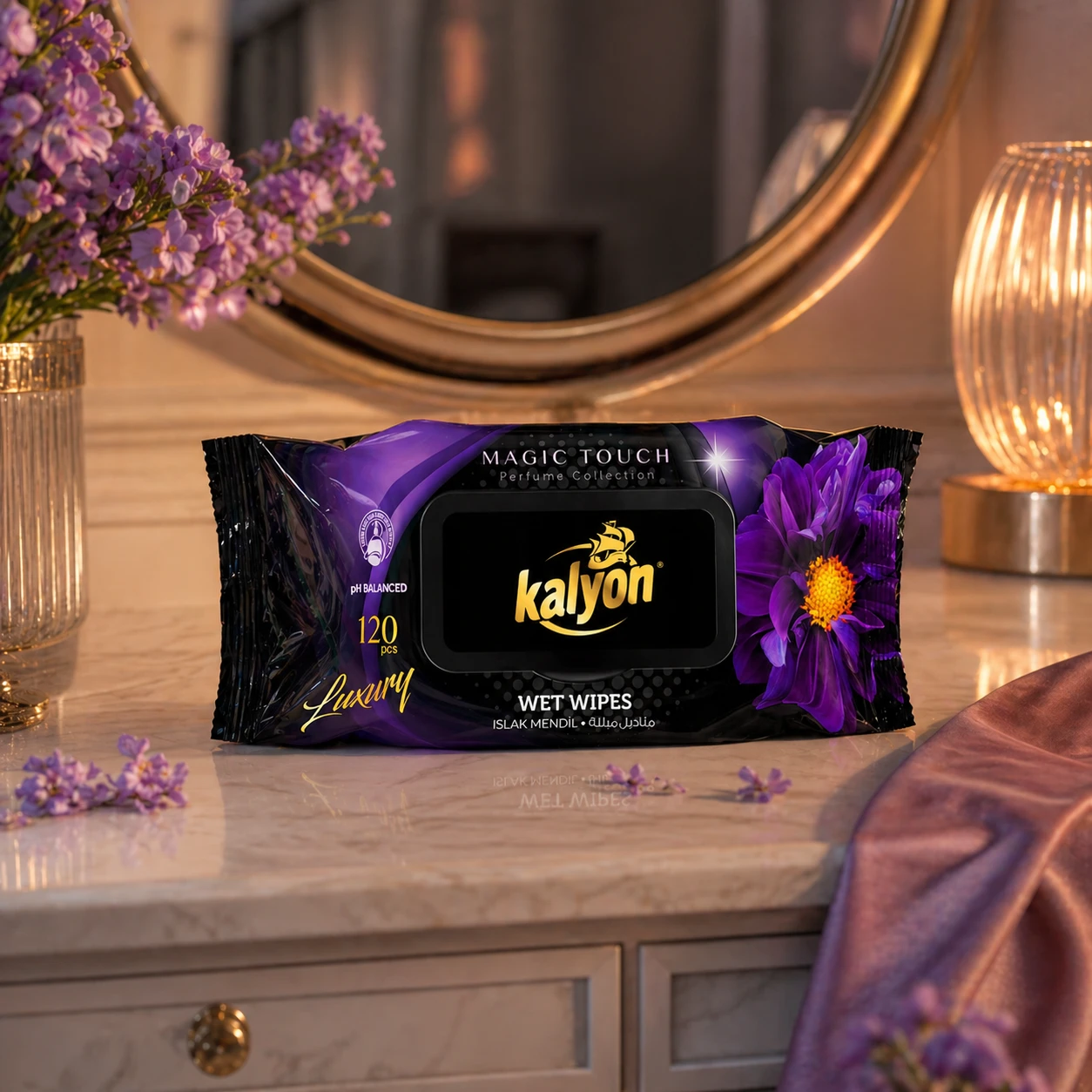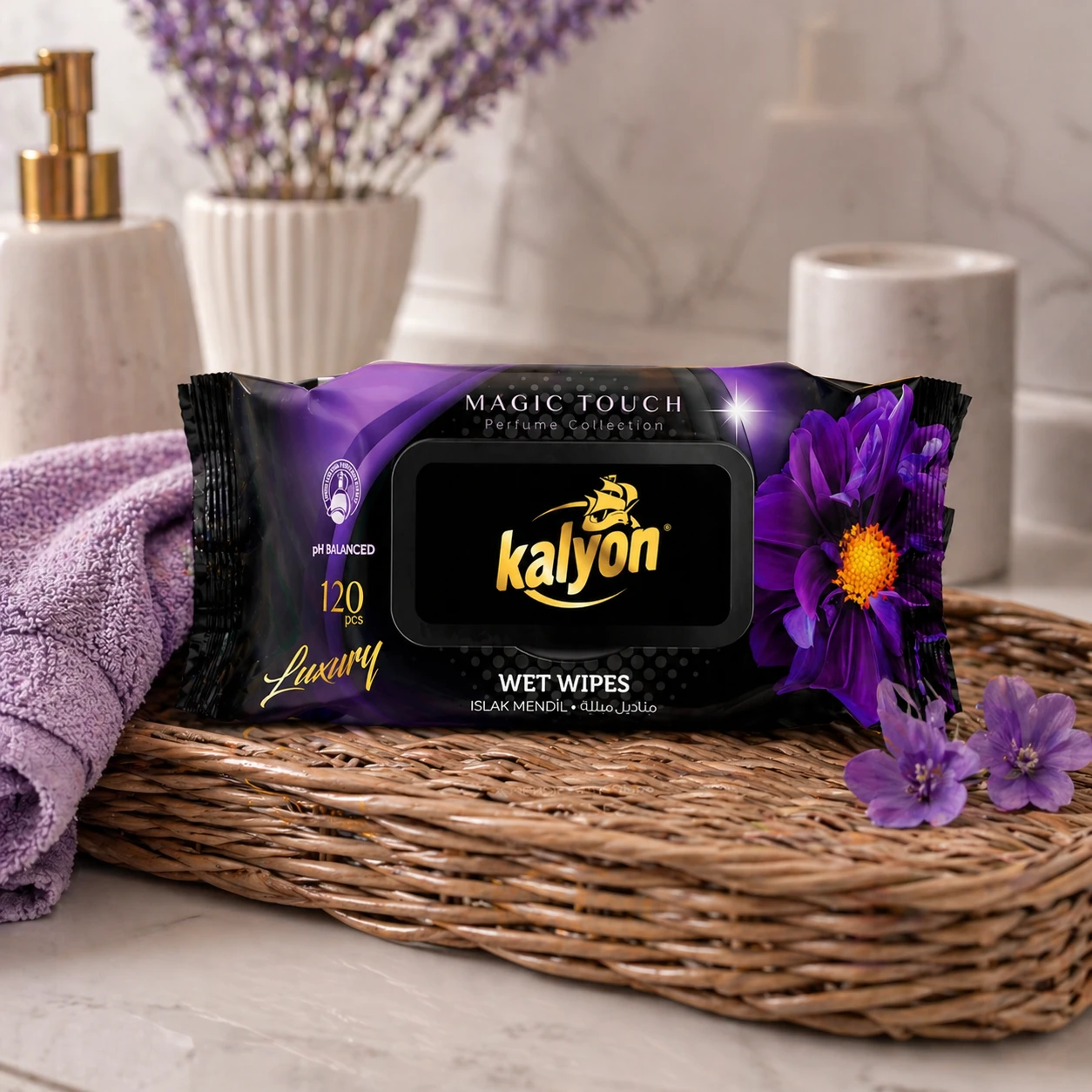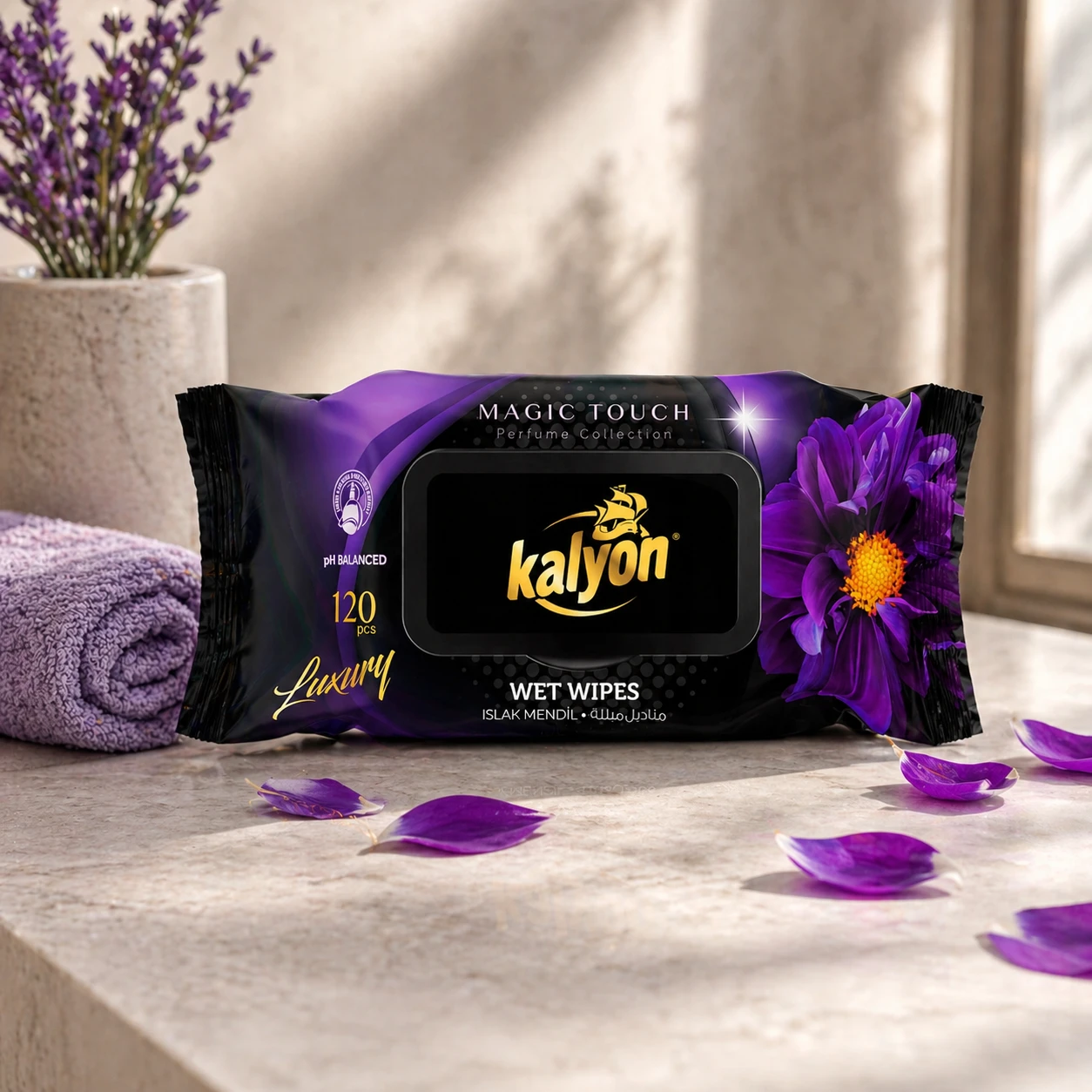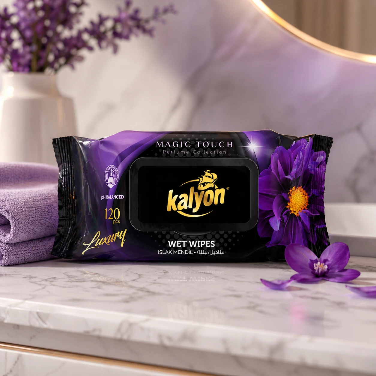 Kalyon chusteczki nawilżane perfumowane Magic Touch 120 szt. z kolekcji Luxury to miękkie, gęste chusteczki o perfumowanym zapachu. Producent deklaruje brak alkoholu i parabenów oraz zrównoważone pH. Opakowanie z klapką chroni przed wysychaniem