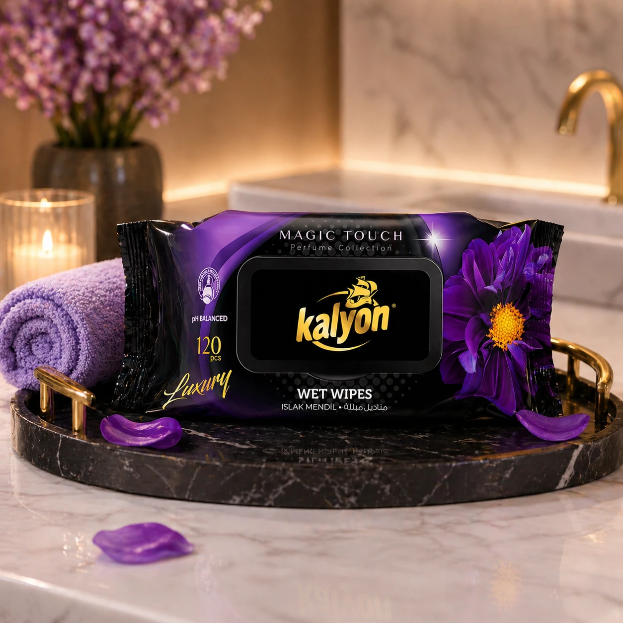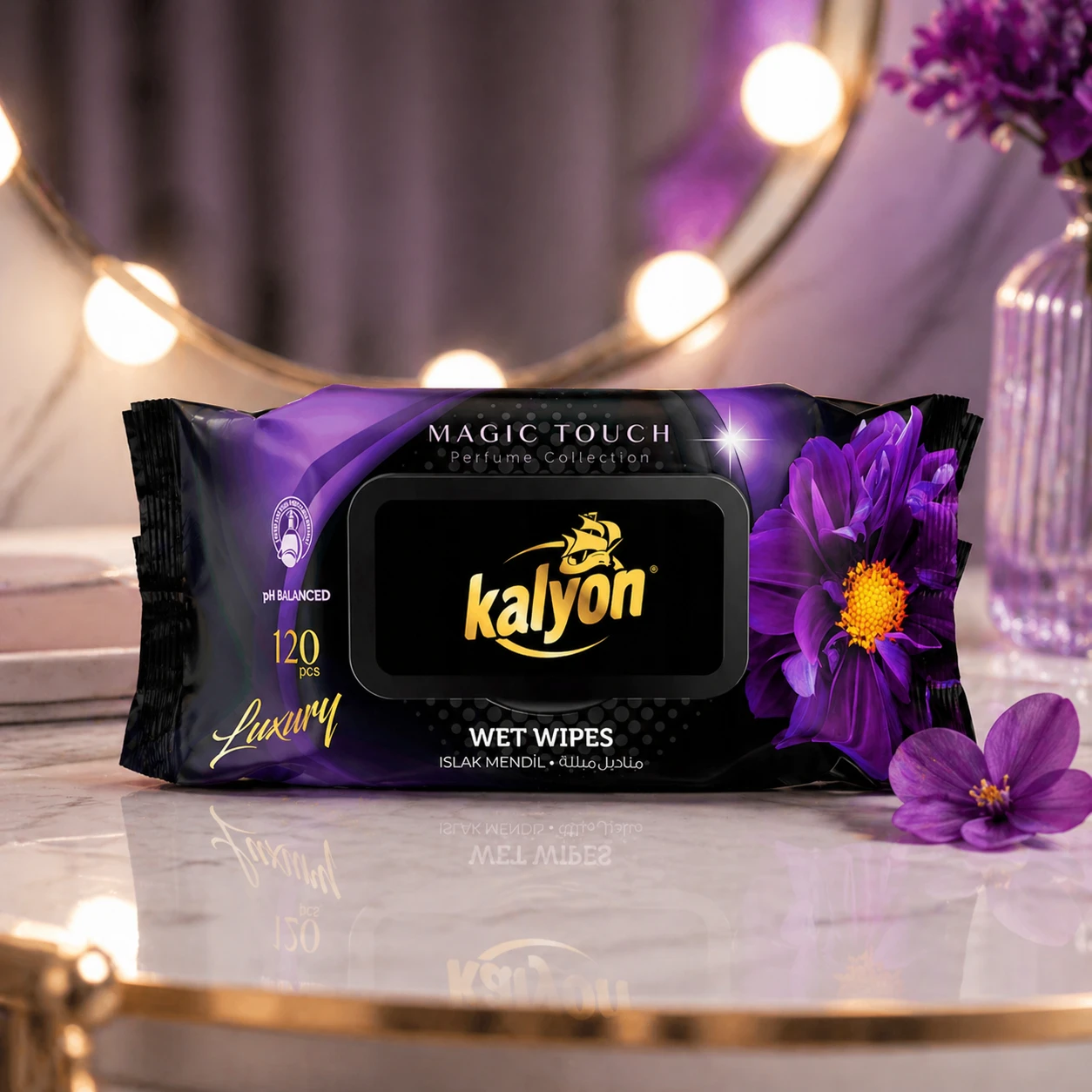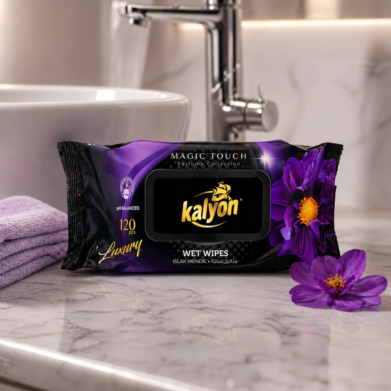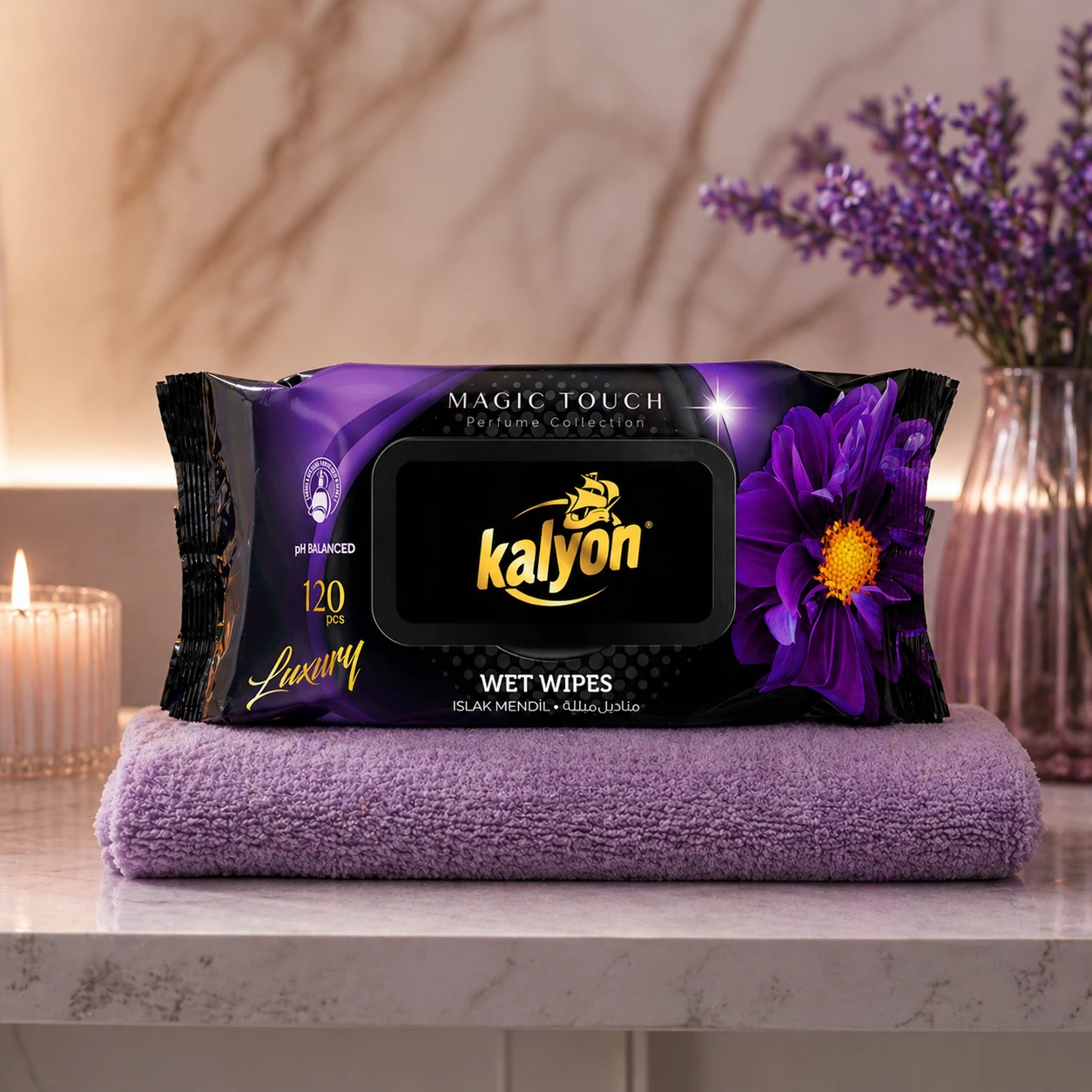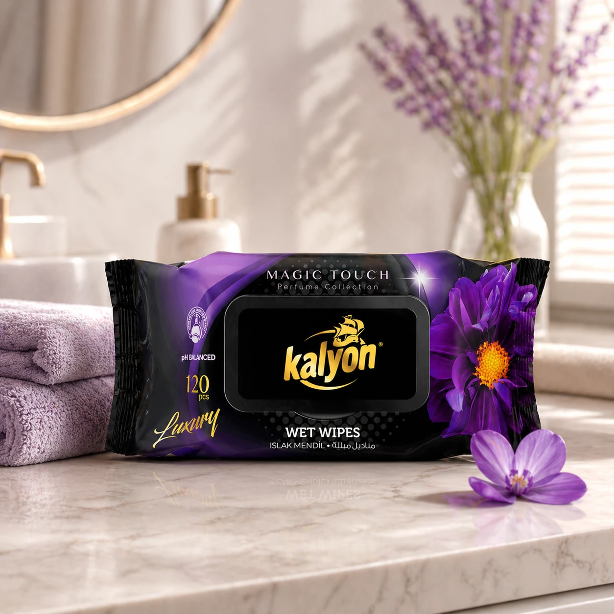 Kalyon chusteczki nawilżane perfumowane Magic Touch 120 szt. z kolekcji Luxury to miękkie, gęste chusteczki o perfumowanym zapachu. Producent deklaruje brak alkoholu i parabenów oraz zrównoważone pH. Opakowanie z klapką chroni przed wysychaniem