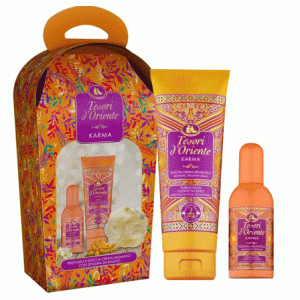 Tesori d’Oriente Karma to zestaw zapachowy dla osób, które lubią ciepłe, otulające aromaty z orientalną nutą. W komplecie znajdziesz wodę toaletową EDT 100 ml oraz żel pod prysznic 250 ml w tej samej linii zapachowej Karma – to idealny duet do codziennej pielęgnacji i budowania charakterystycznego, zmysłowego zapachu na skórze.