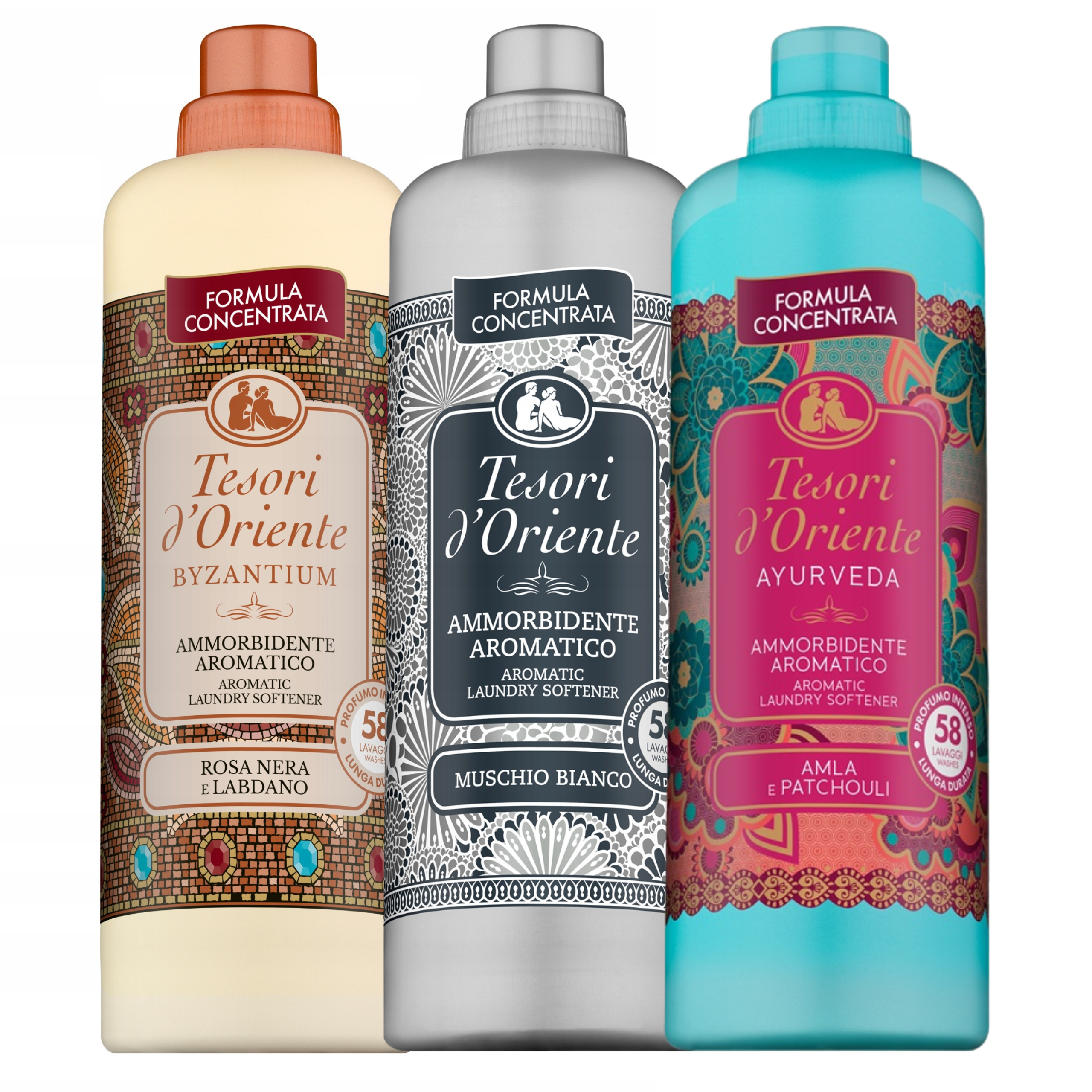 Zestaw 3x Tesori d’Oriente – koncentraty do płukania tkanin 1160 ml (Ayurveda, Byzantium, Muschio Bianco)