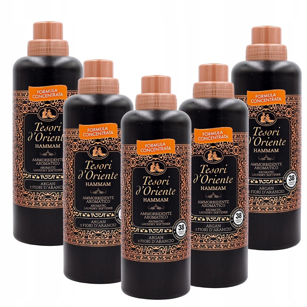 Przenieś się do orientalnego spa z każdym domowym praniem! Zestaw 5x Tesori d'Oriente Hammam to Twój bilet do świata luksusowej miękkości i zniewalającego zapachu. Ten wydajny pakiet włoskich koncentratów otula tkaniny zmysłowym aromatem szlachetnego olejku arganowego i kwiatu pomarańczy. Płyn zapobiega elektryzowaniu się materiałów, ułatwia prasowanie i gwarantuje zapas niesamowitej świeżości w Twojej garderobie na długie miesiące.